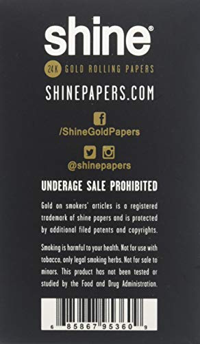Shine 24-karaats gouden rolling papers: het wereldwijd unieke gouden rolling papier van Shine van 24-karaats goud biedt exclusief rookgenot. Bij de Shine King Size gaat het om het eerste en unieke 24-karaats echt gouden henneppapier, dat met een certificaat van echtheid bij je thuis wordt geleverd. De hoge kwaliteit van het Shine Gold Paper zorgt voor een langzaam en gelijkmatig verbranden. Bijzonderheden: eenvoudig gebruik van de King Size grote gouden papieren, wordt door een ultradun henneppapier en een speciale plakstrip mogelijk gemaakt. Bij gebrek aan draagervaring raden wij toch onze Shine 24k Gold Papers Cone pre-rolled. Cadeau-idee voor genieters: het ideale cadeau voor bijzondere vrienden die veel rookplezier willen waarderen en van speciale avonden willen genieten. Feestavonden met goud veredelen en ze onvergetelijk maken. Beleef nu onvergetelijke gouden momenten. Geen smaakverandering in het rookproduct, eerder een verbetering door het zeer dunne henneppapier.